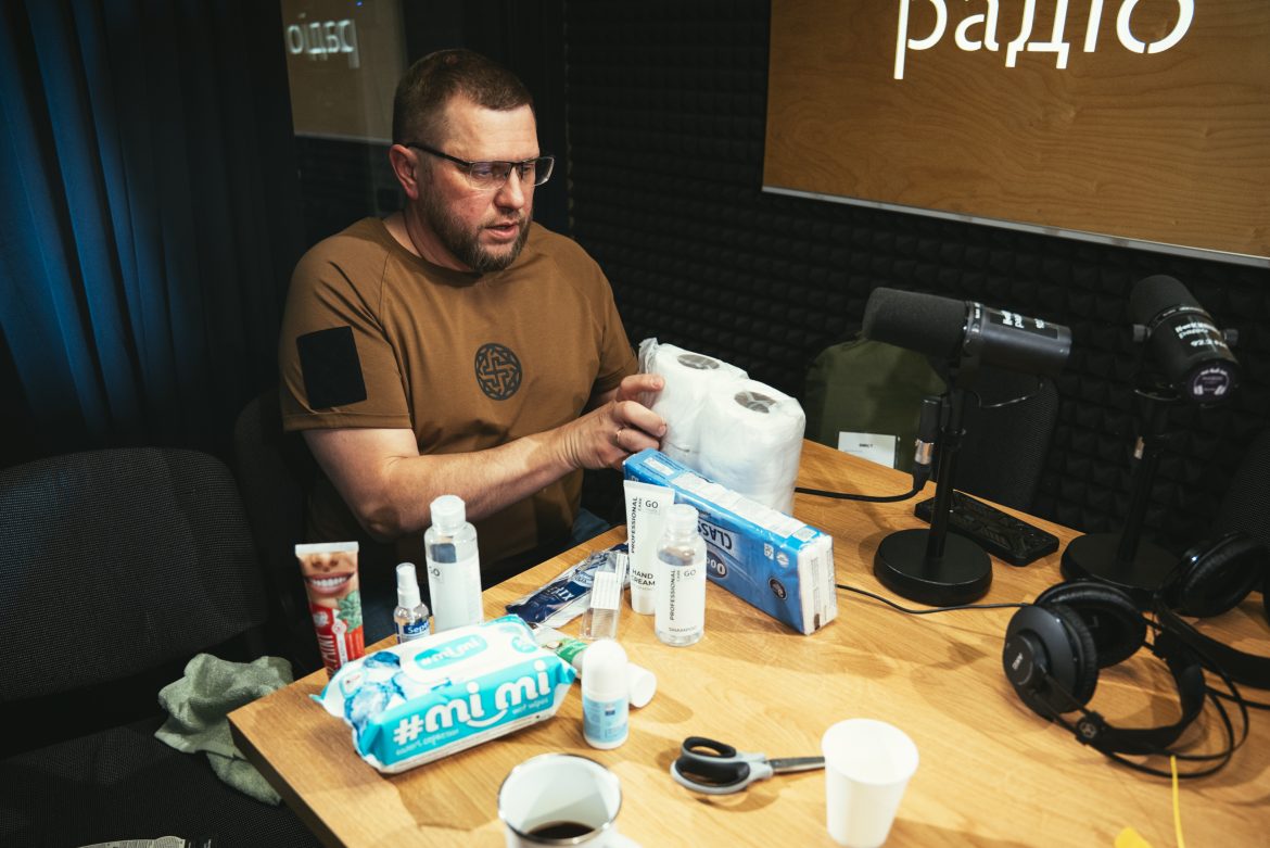 «Набір із чотирьох рулонів туалетного паперу, велика пачка сухих серветок — десять штук. Рушник досить великого розміру. Гребінець, три одноразові станки, зубна щітка, гель для душу, велика пачка вологих серветок, антисептик, велика зубна паста, гель для гоління, шампунь, антиперспірант і крем для рук», — перелічив він.